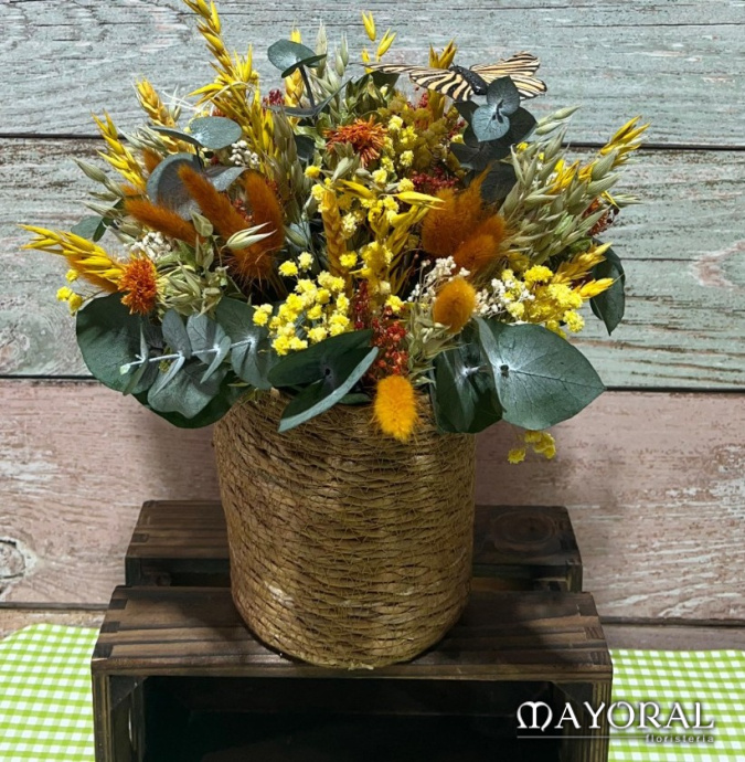 Centro en cesto de mimbre de flores preservadas tonos amarillos