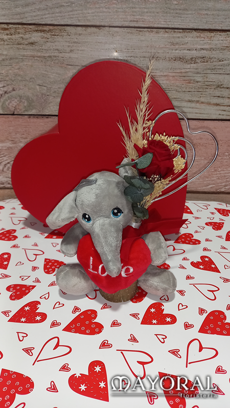Composición peluche pequeño y rosa preservada.