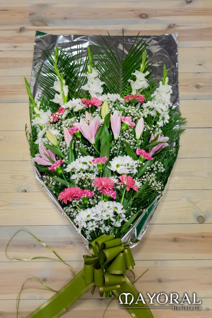 Ramo con flores naturales variadas, claveles, margaritas, lilium, gladiolos, paniculata, verdes...